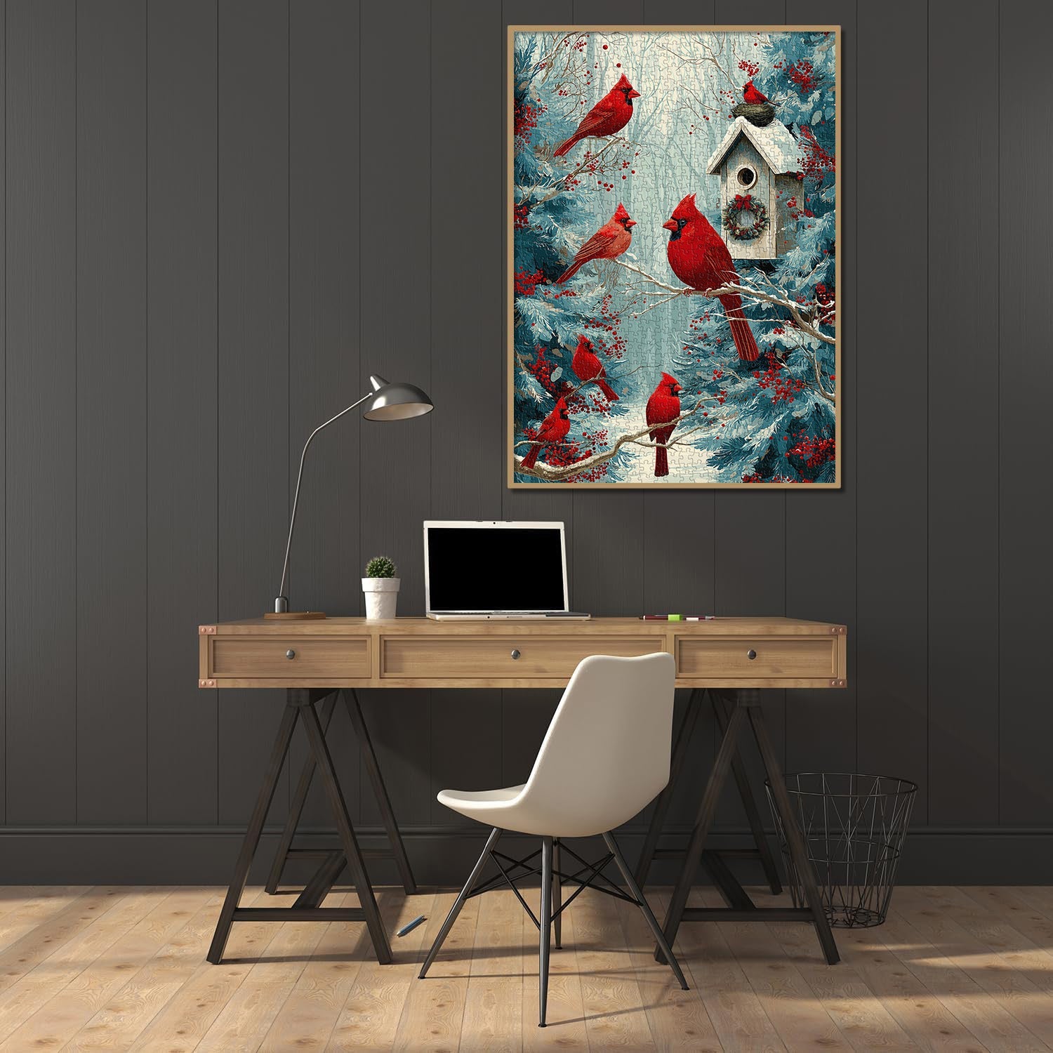 Natural Framing:The composition is framed with pine branches and berries on both sides, leading the viewer’s eye toward the cardinals and birdhouse, giving the artwork a balanced and cozy feel.