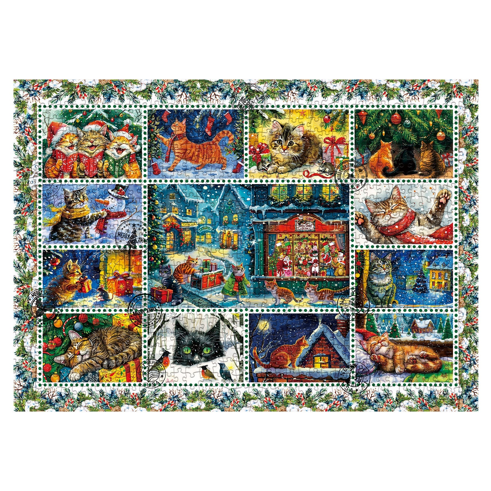 Features a vibrant mosaic of charming cats in festive scenes, from cozying up by the fireplace to playing under the mistletoe, all framed by holly leaves and berries for a touch of Christmas cheer.