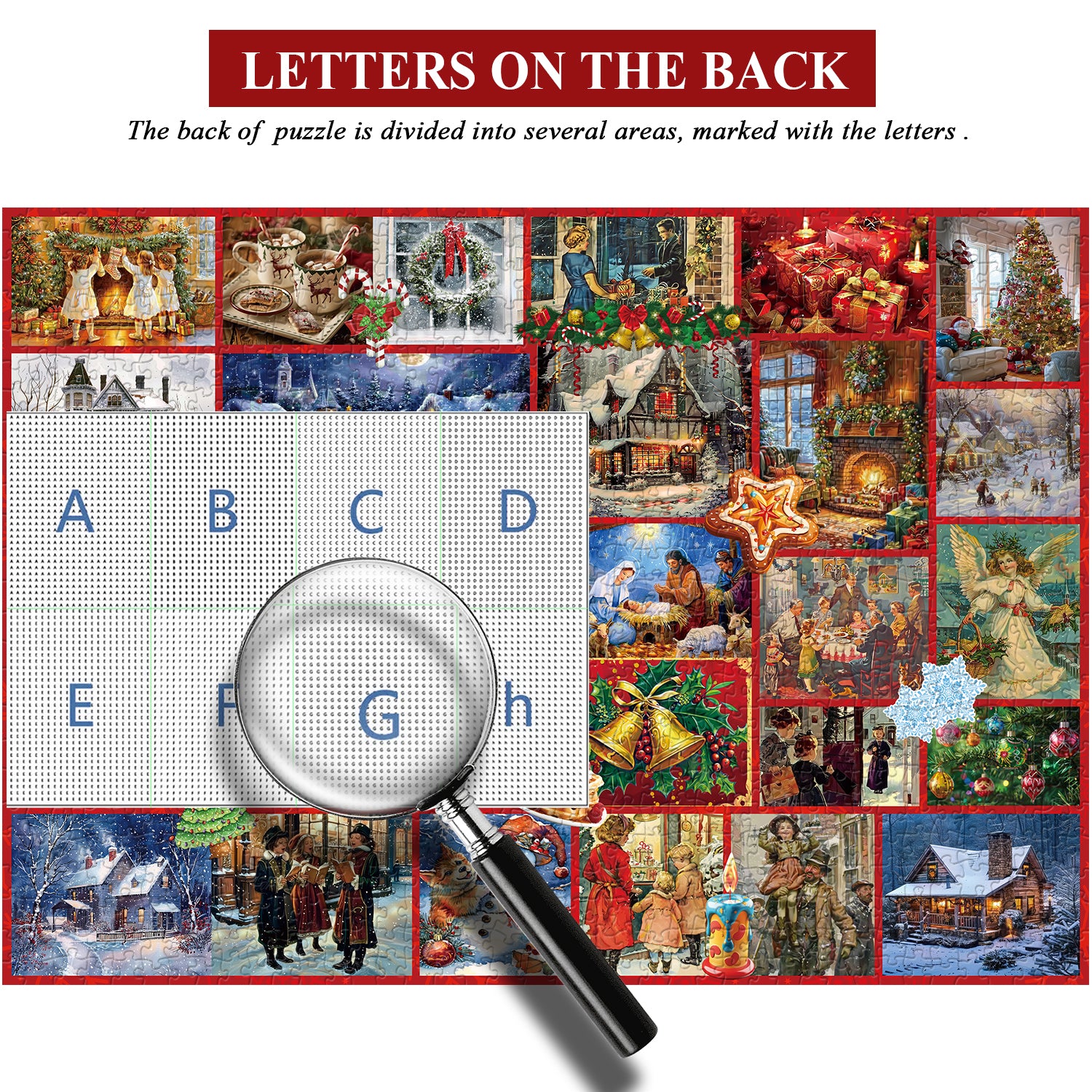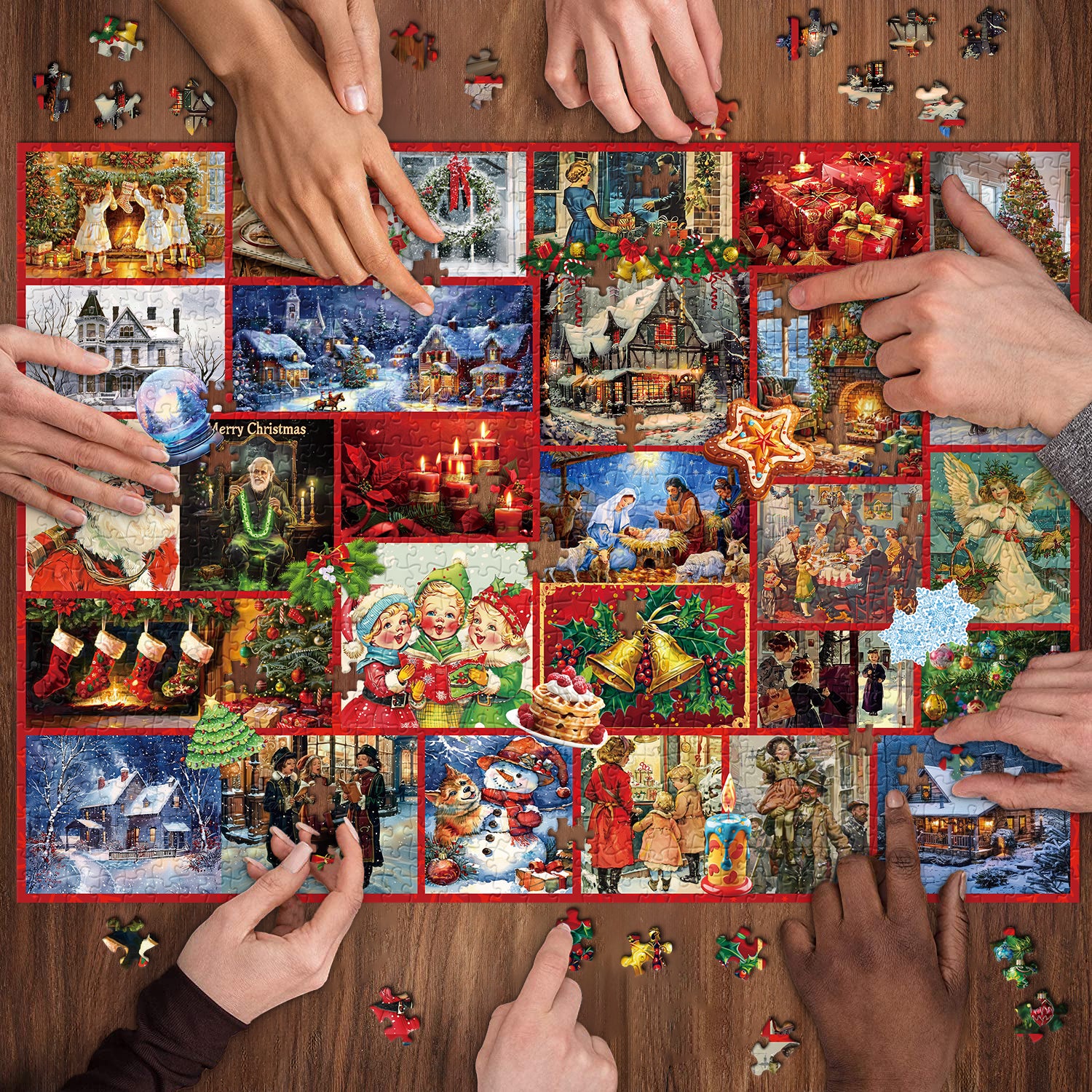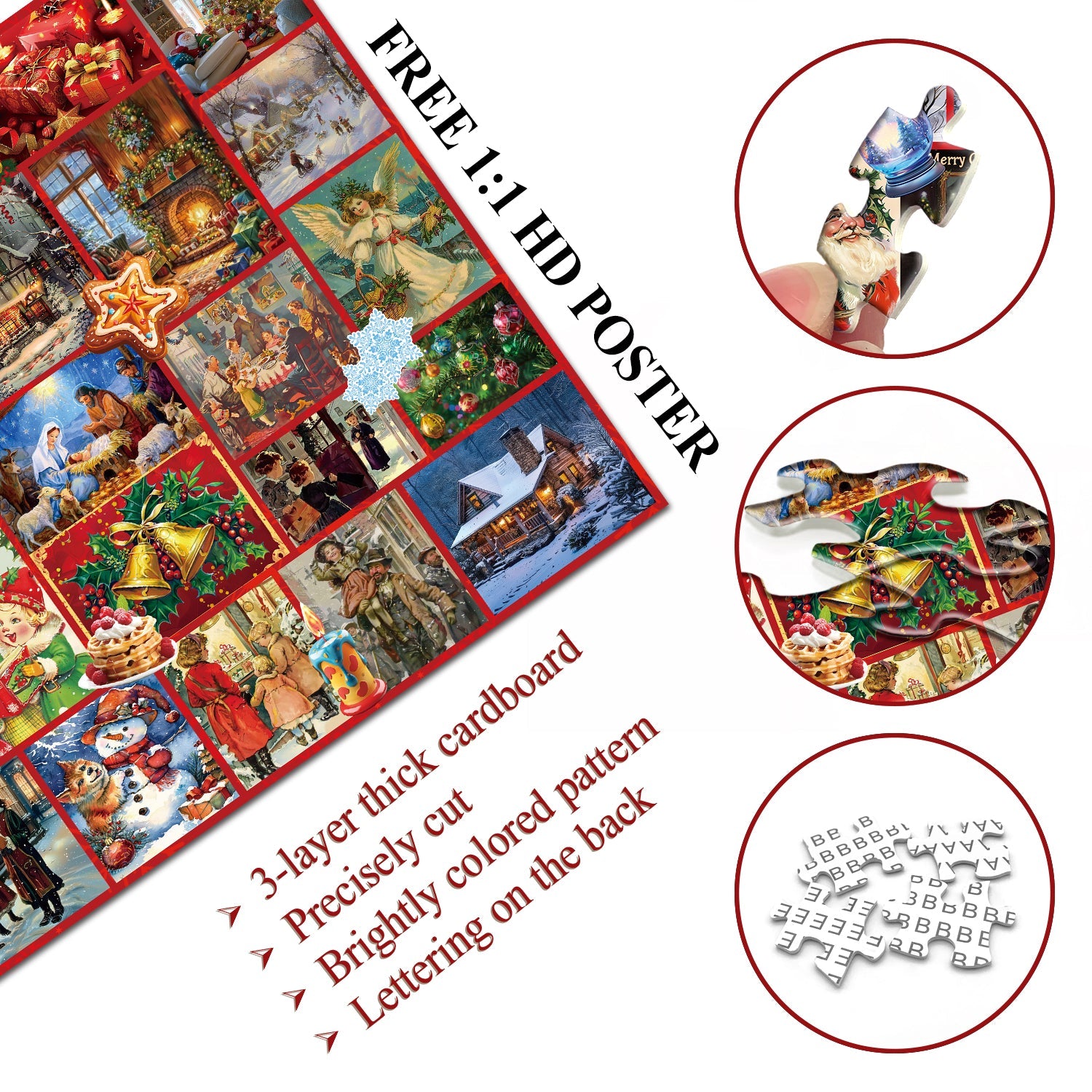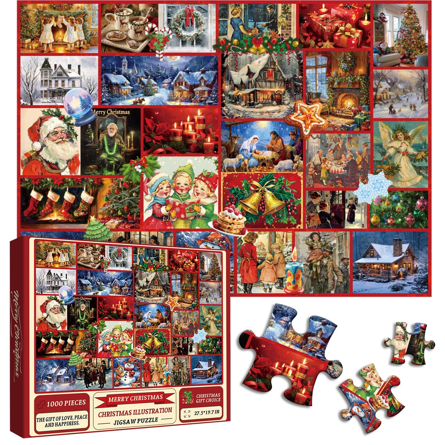 This vibrant puzzle features a collage of various Christmas scenes and characters, each piece adorned with festive decorations. From snowmen and Santa Claus to wreaths and holiday ornaments, every piece captures the essence of the season.