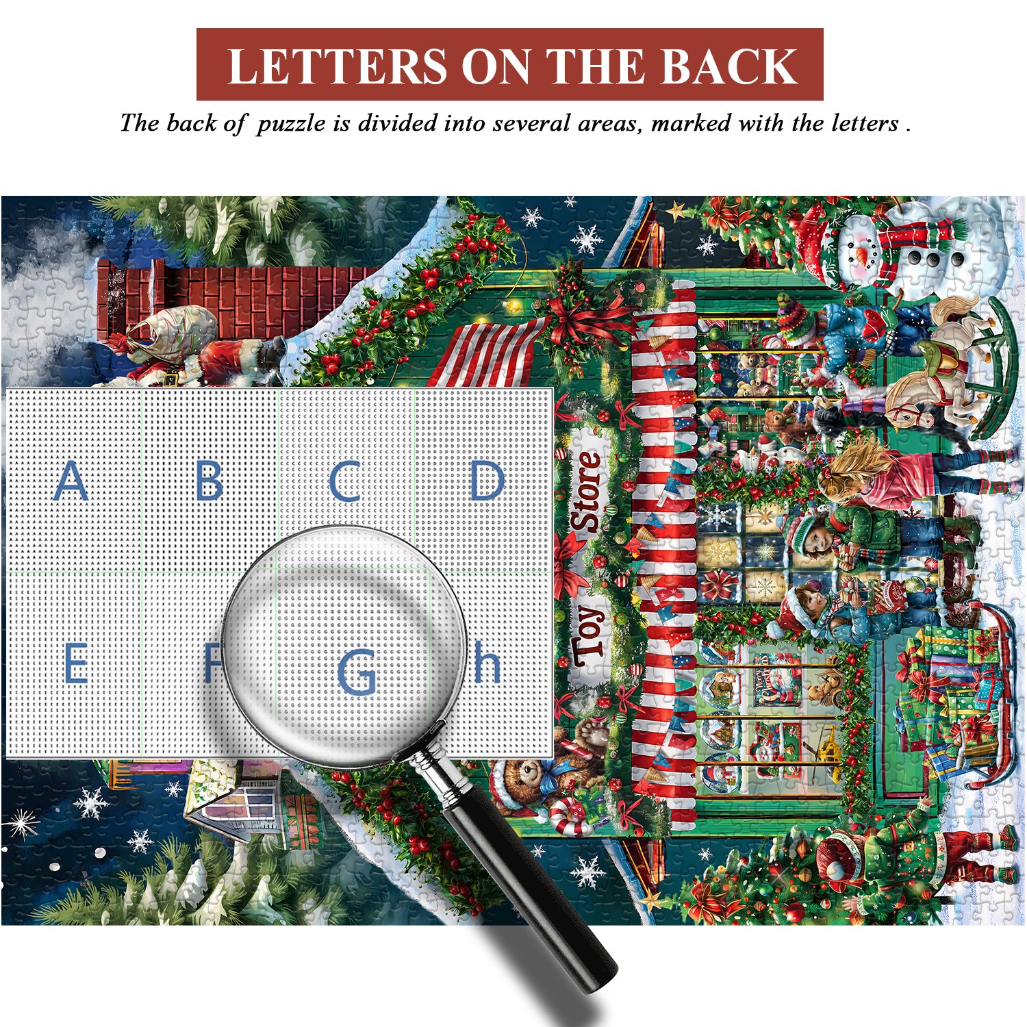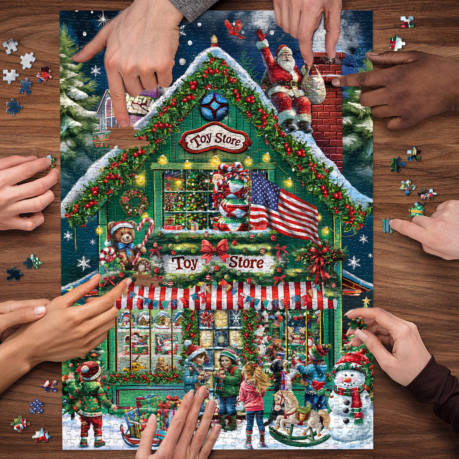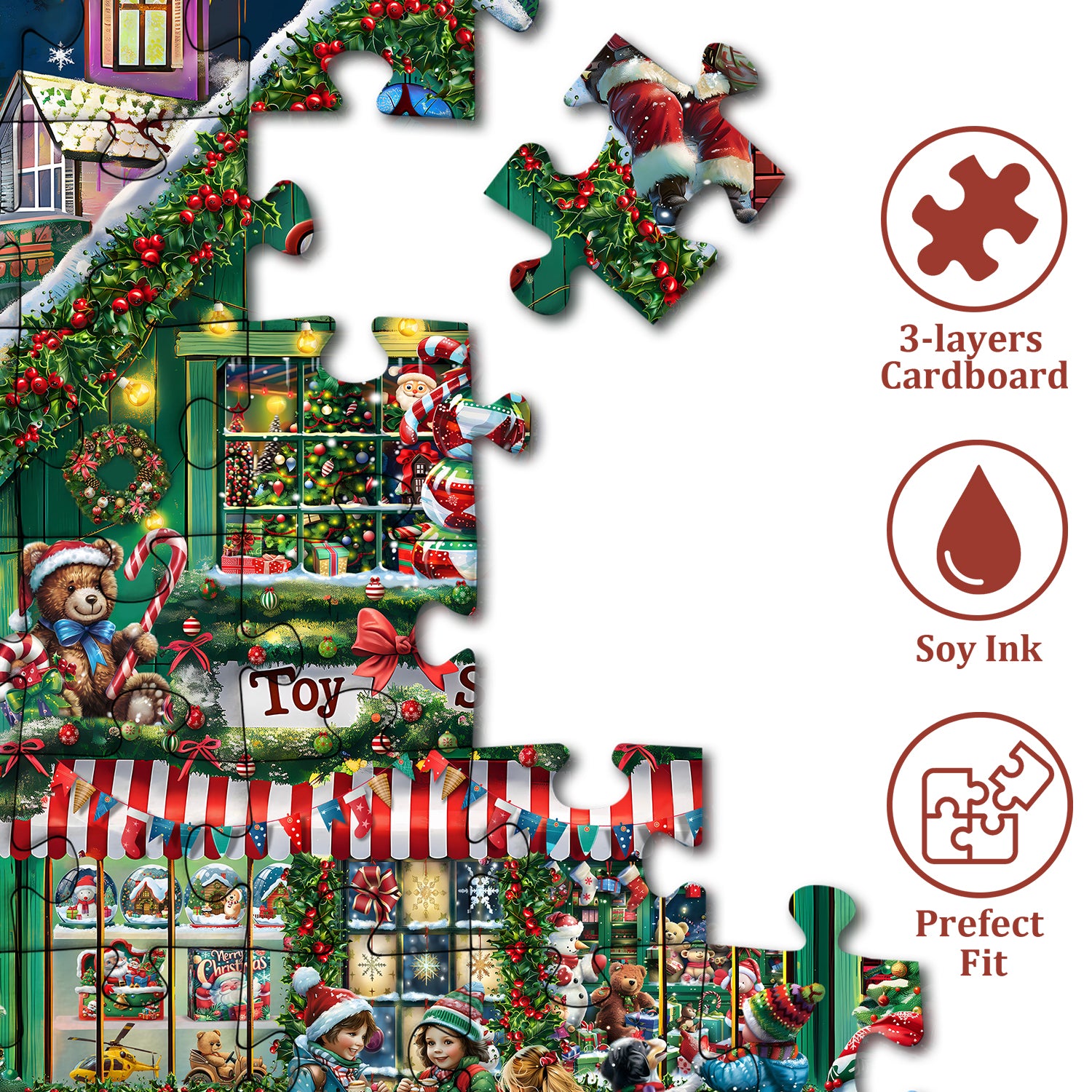 A Festive Scene: Dive into the joyful spirit of Christmas with this delightful puzzle featuring a classic Christmas toy store. Santa Claus, snowmen, and children are playfully gathered outside, creating a vibrant and heartwarming holiday scene.