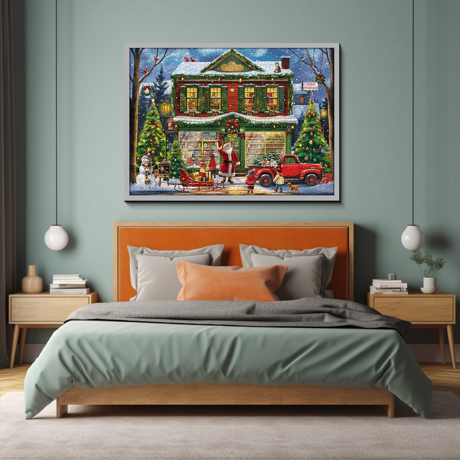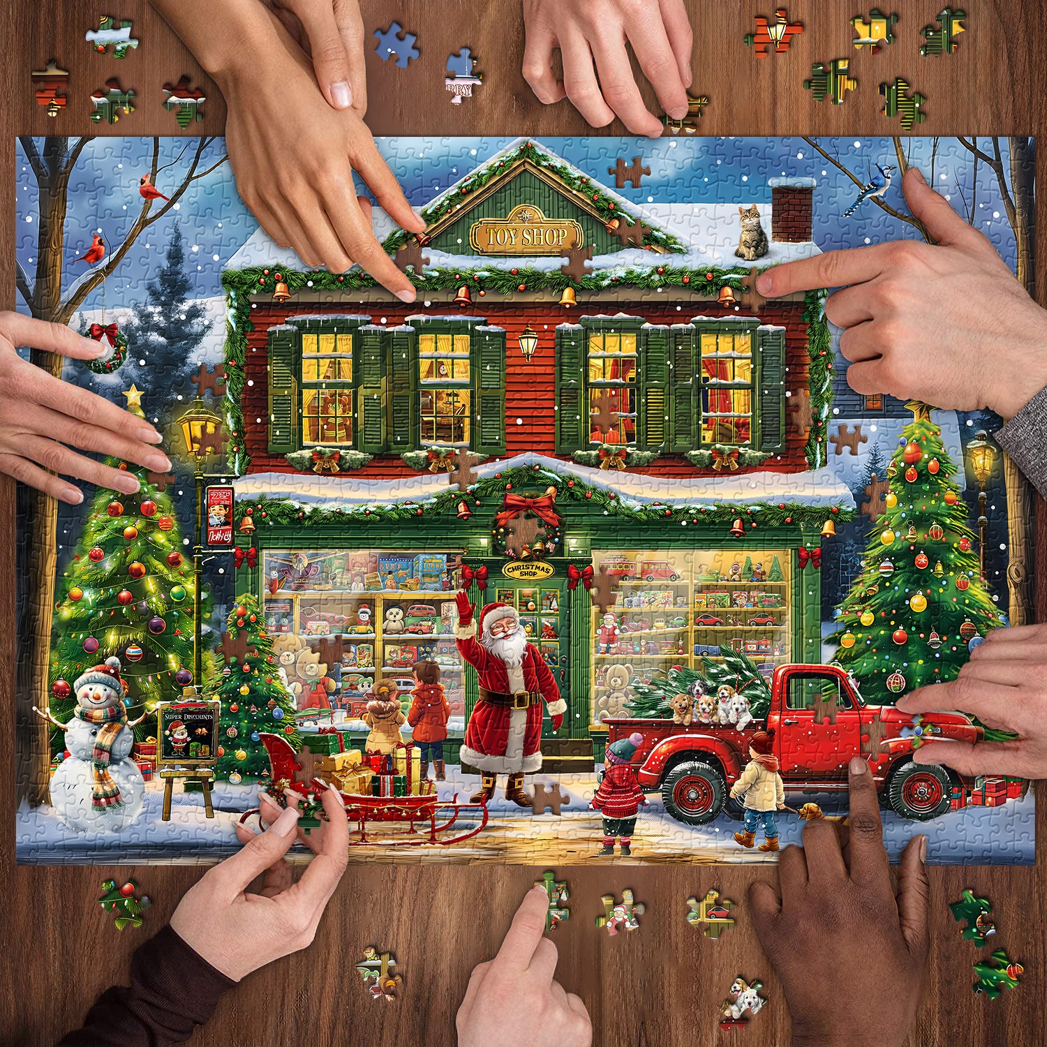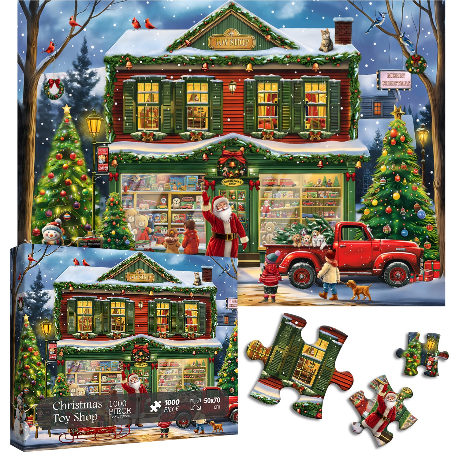 Vibrant Holiday Scene: Dive into a delightful, color-rich Christmas setting with our 1000-piece puzzle, showcasing a festive toy shop adorned in green and brown hues. The charming shopfront is brought to life with warm lights, snowy decorations, and joyous holiday spirit.