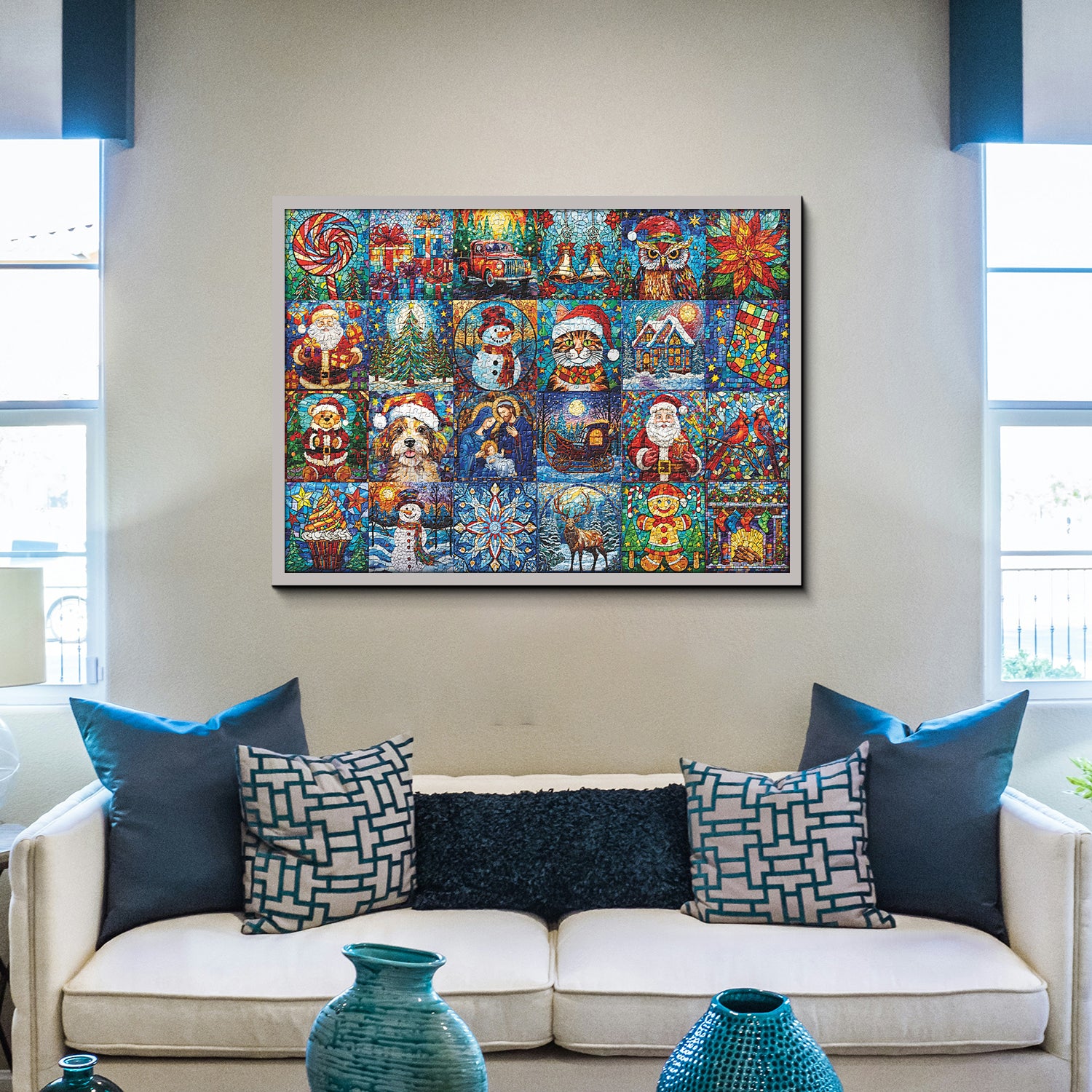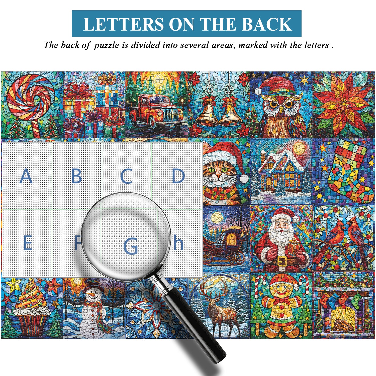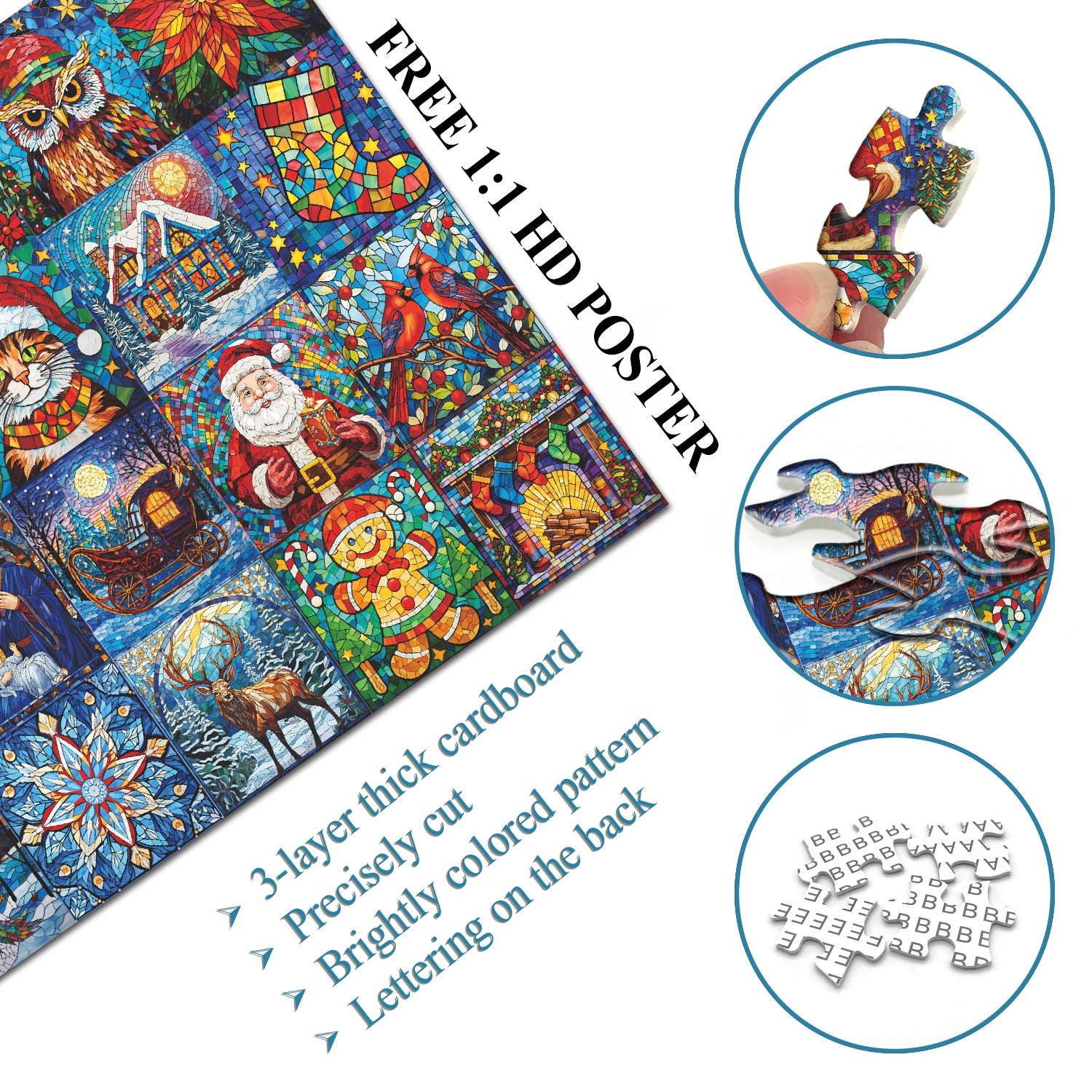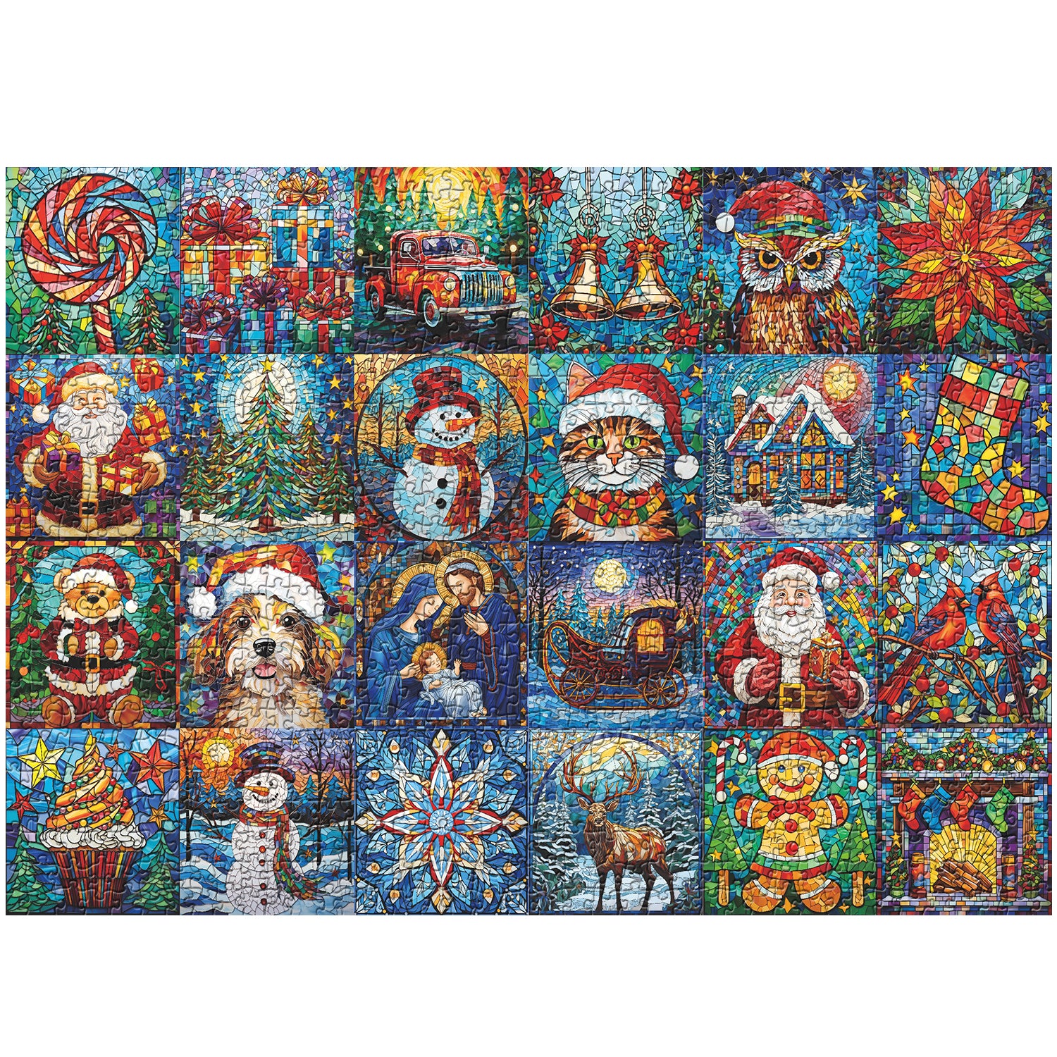 Colorful Christmas Mosaic:Dive into the festive spirit with our Christmas Treasures 1000-piece puzzle, featuring a vibrant mosaic of winter characters. Each puzzle piece showcases different holiday figures, such as snowmen, Santa Claus, and playful dogs with toys or festive decorations, arranged in intricate patterns.
