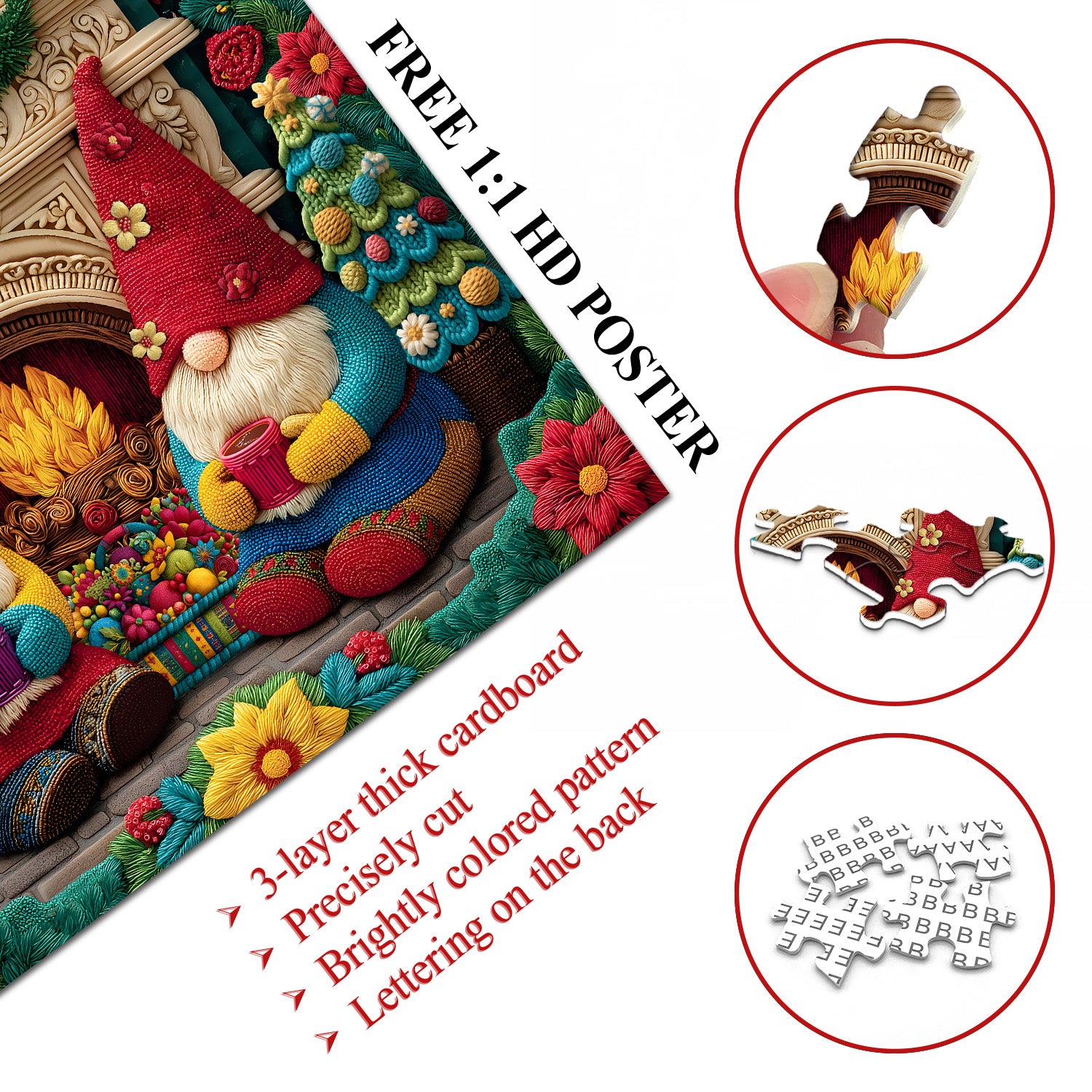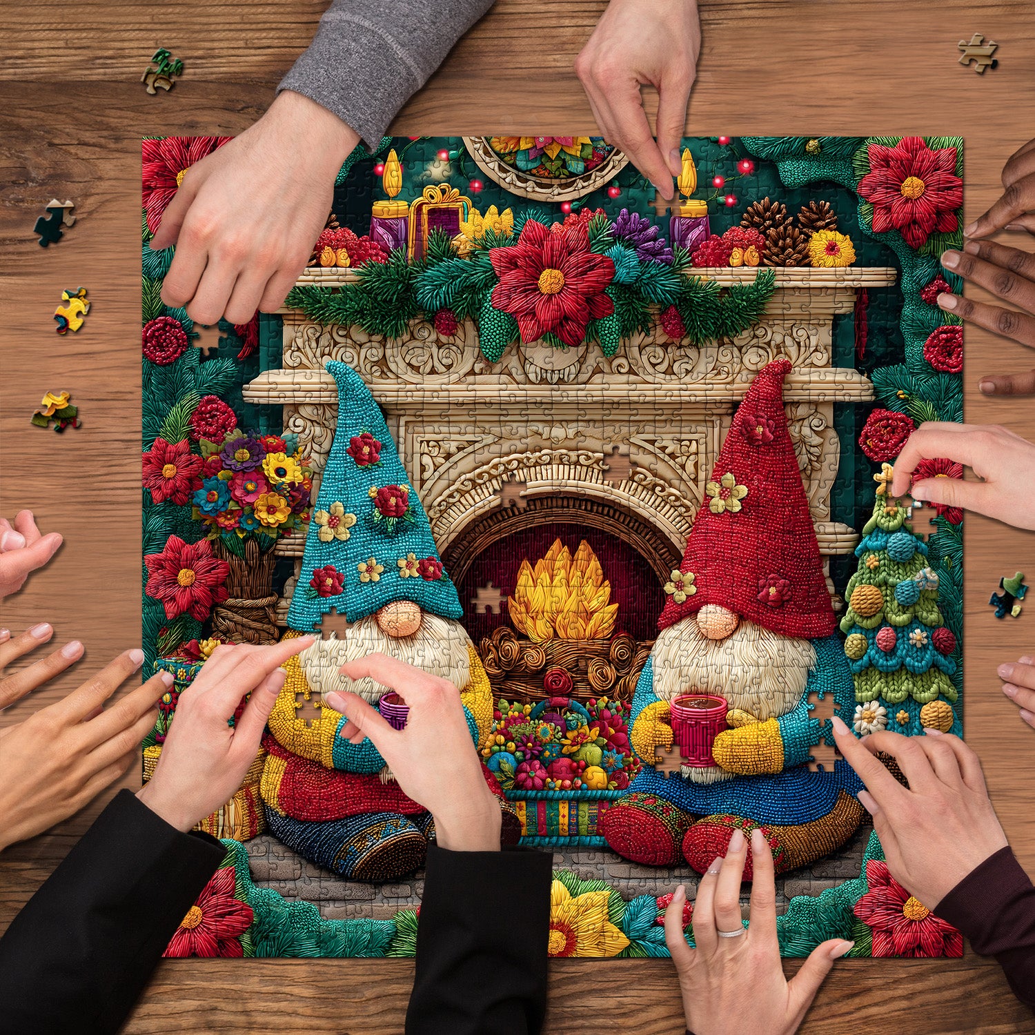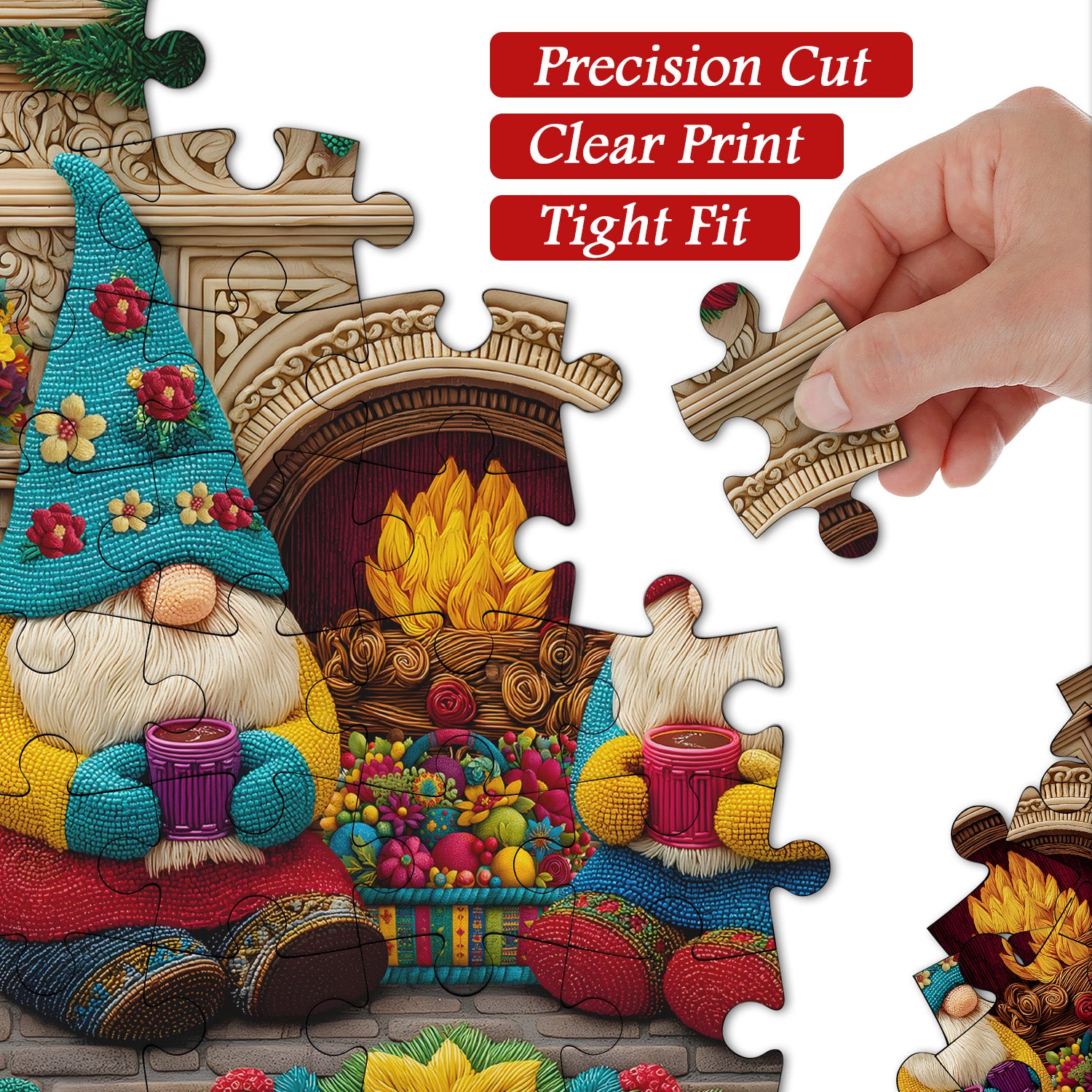 Charming & Whimsical Design Dive into a magical winter wonderland with two cozy gnomes sitting by the fireplace, surrounded by vibrant flowers, festive decorations, and warm colors. This heartwarming scene brings joy to your puzzle time.