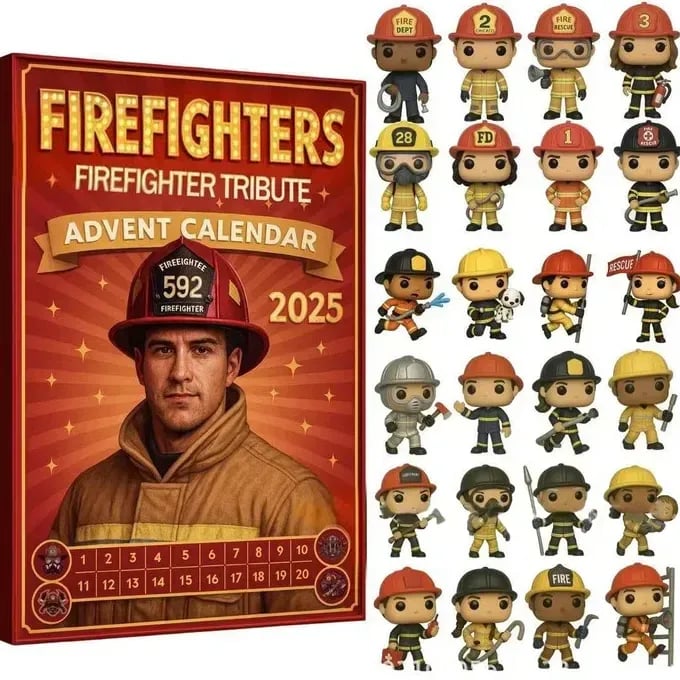 It is a firefirefighter TRIBUTE ADVENT CALENDAR gift box named "FIREFIGHTERS FIREFIGHTER TRIBUTE ADVENT CALENDAR 2025", which contains 24 firefirefighter figurates.