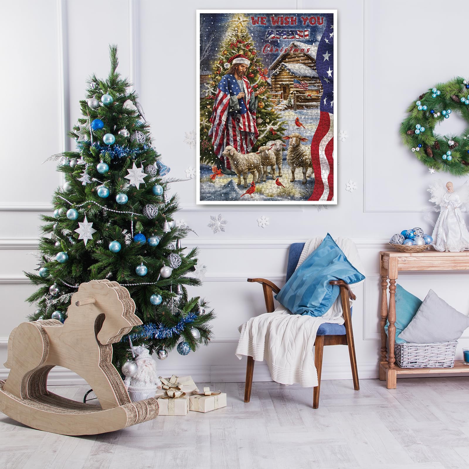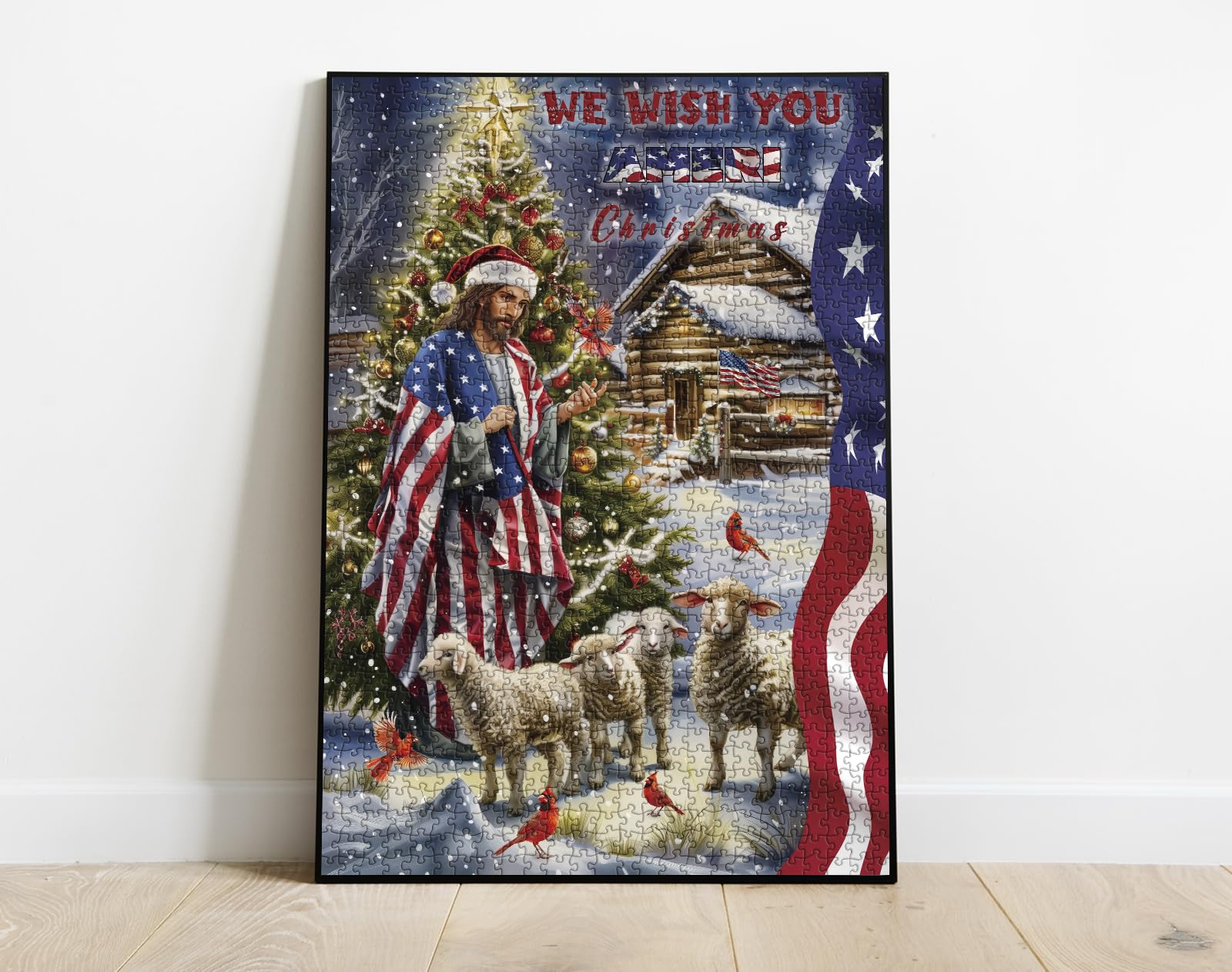 Colorful Succulent Puzzle: Jesus Christ dressed in attire adorned with the flag, stands solemnly in the snow, the sheep surrounding him while the red birds add a splash of life and energy to the chilly winter scene